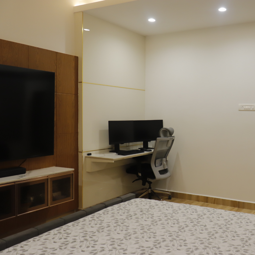 Mrs. Sahiti bedroom has huge open wardrobe. King size cot with fabric back panel which acts cozy cushion to the back. And ceiling with beveled mirror. Tv panel attached with study unit.