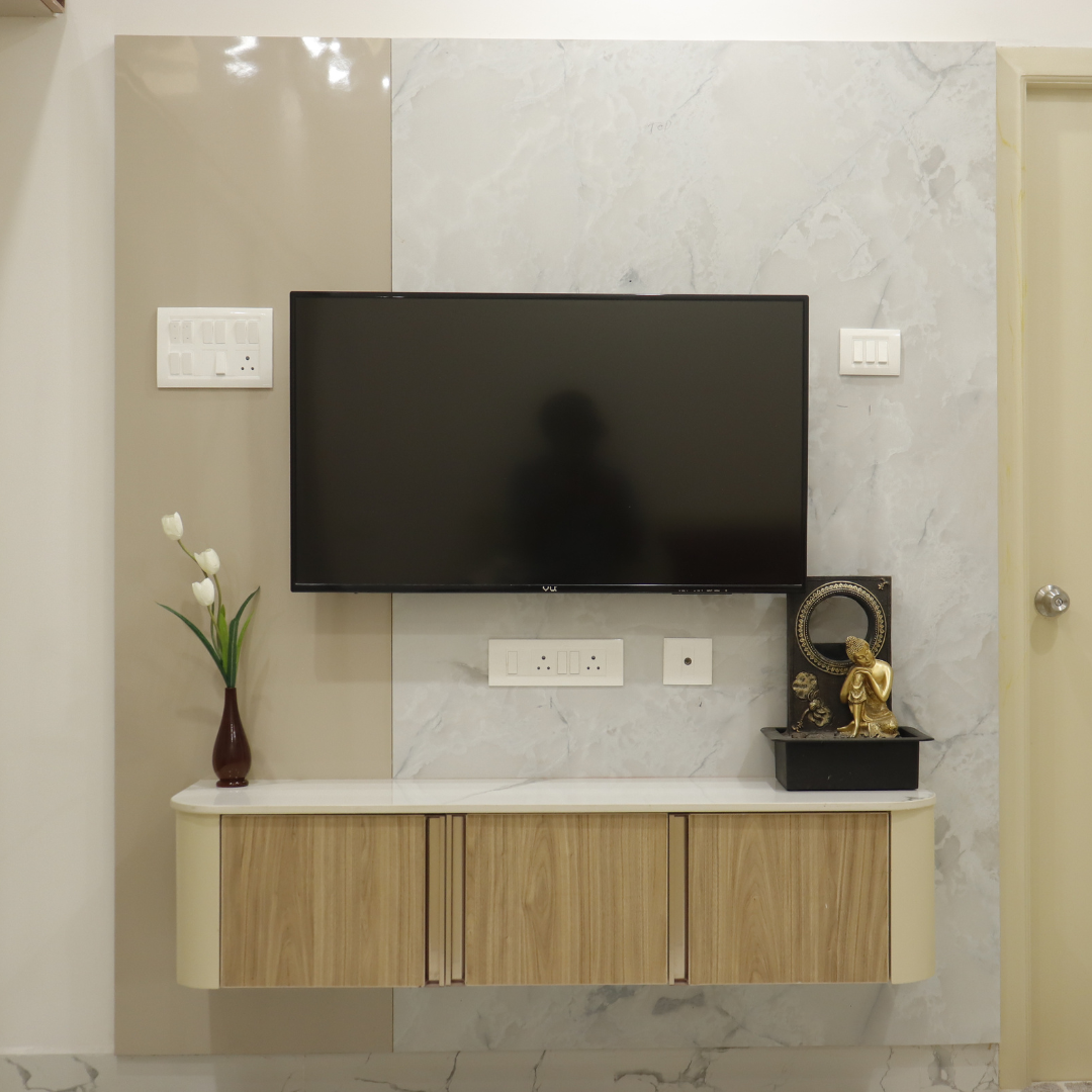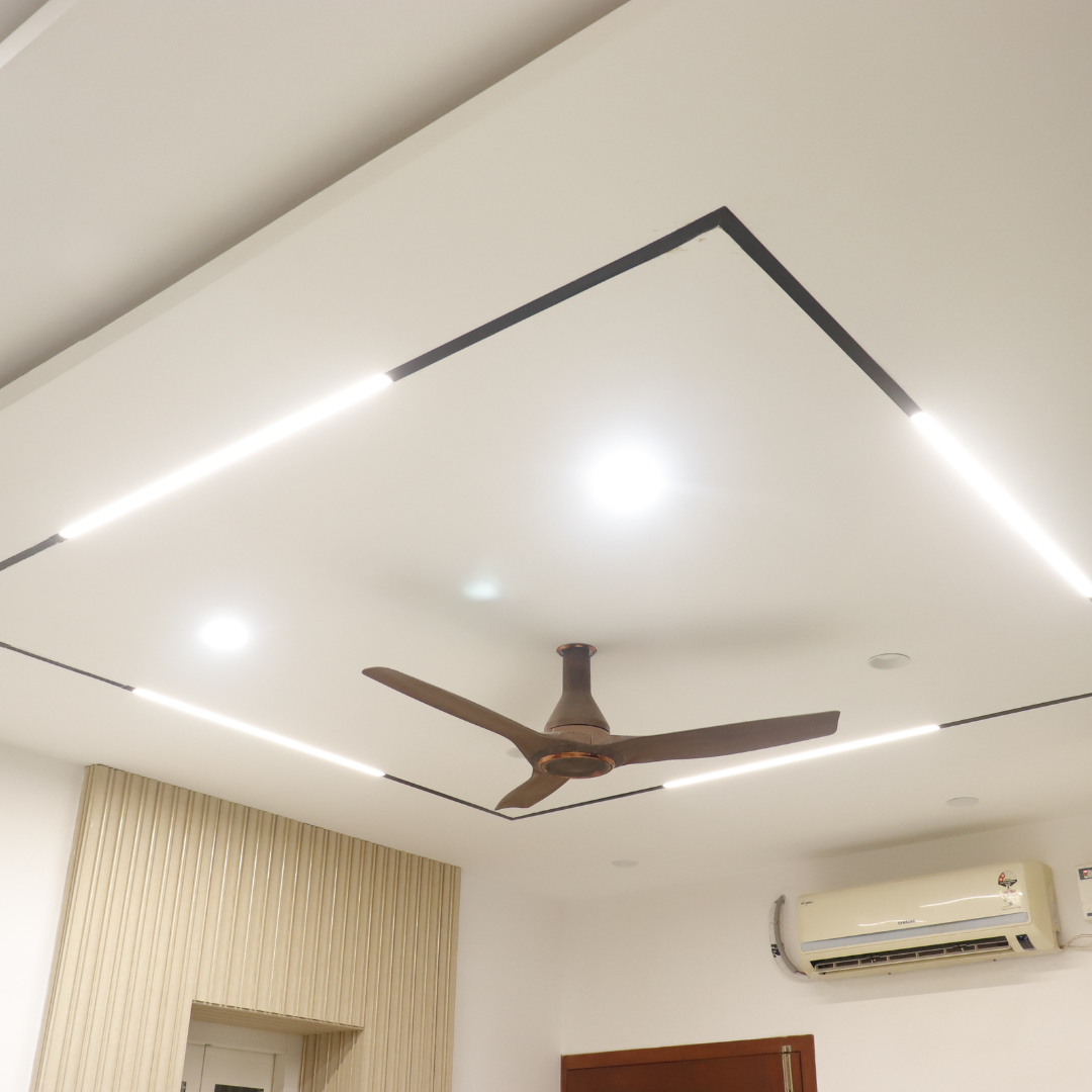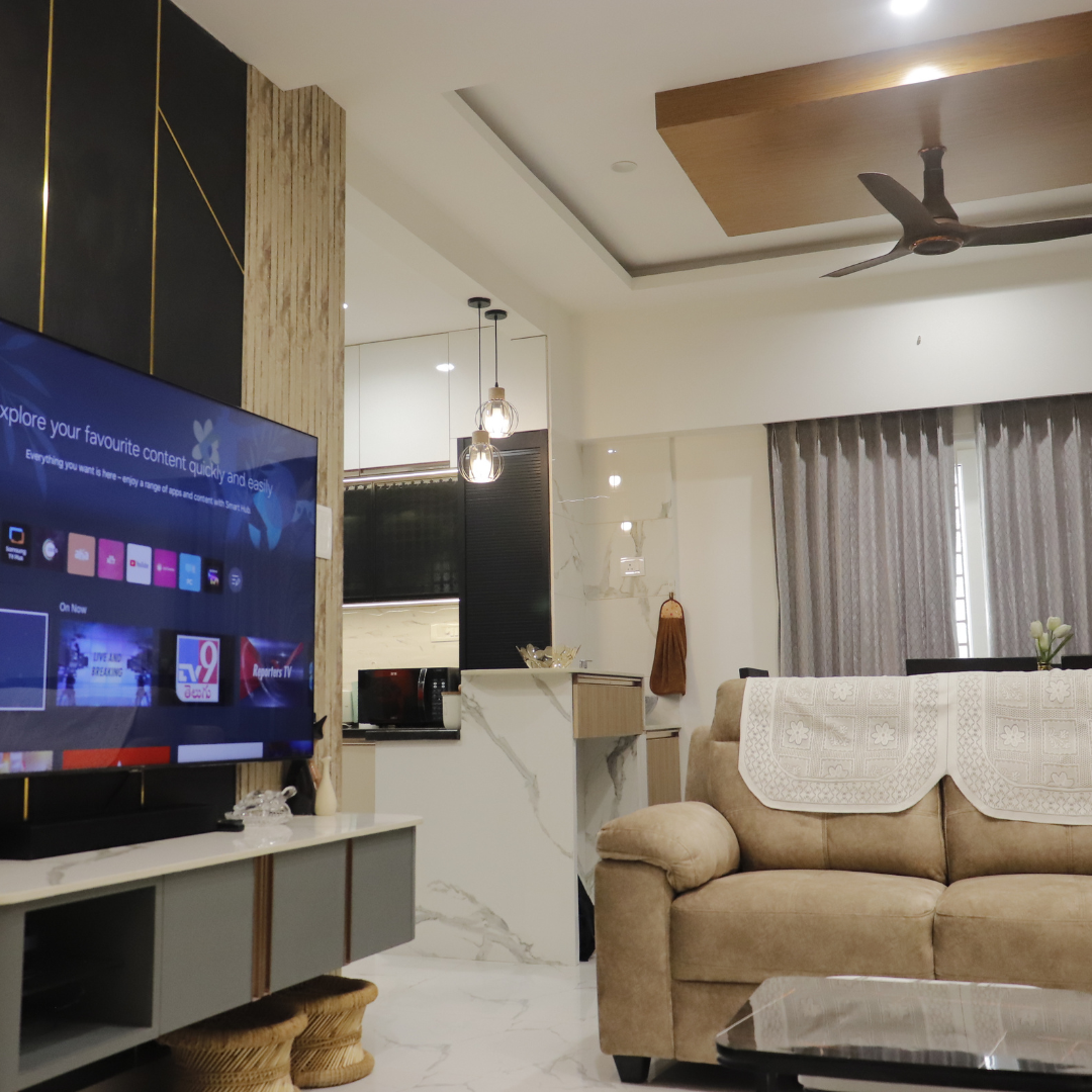 Living room with Diwan & Tv panel. Profile lights for the false ceiling. Wooden ceiling installed to highlight the dining space. Lift space allocated in the Hall it has access till 2nd floor daughter bedroom.