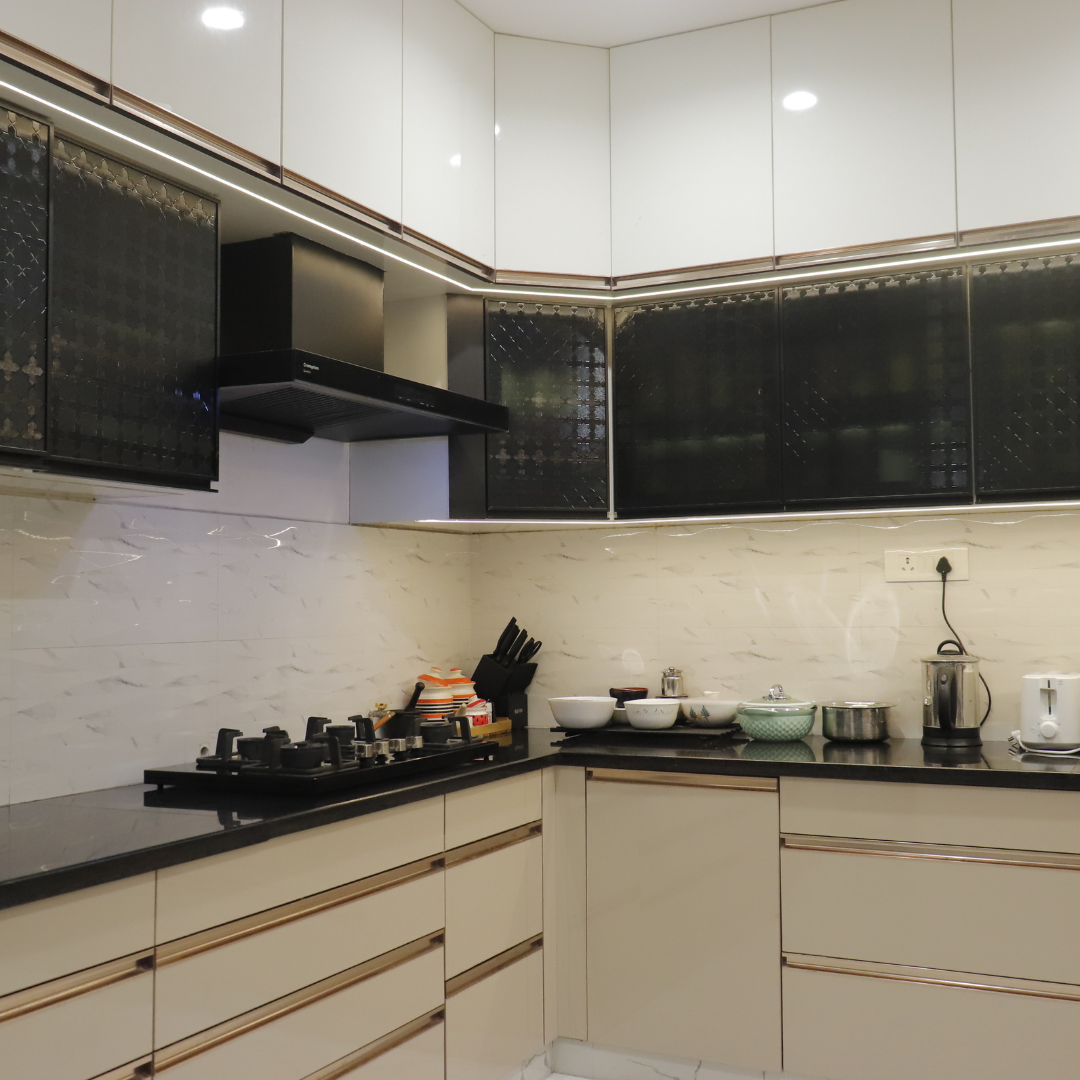 Kitchen is a Modular Type; it has all the storage as per the client requirement with crockery display unit in the kitchen itself. Gas provision taken out to make it seamless service for the utility.