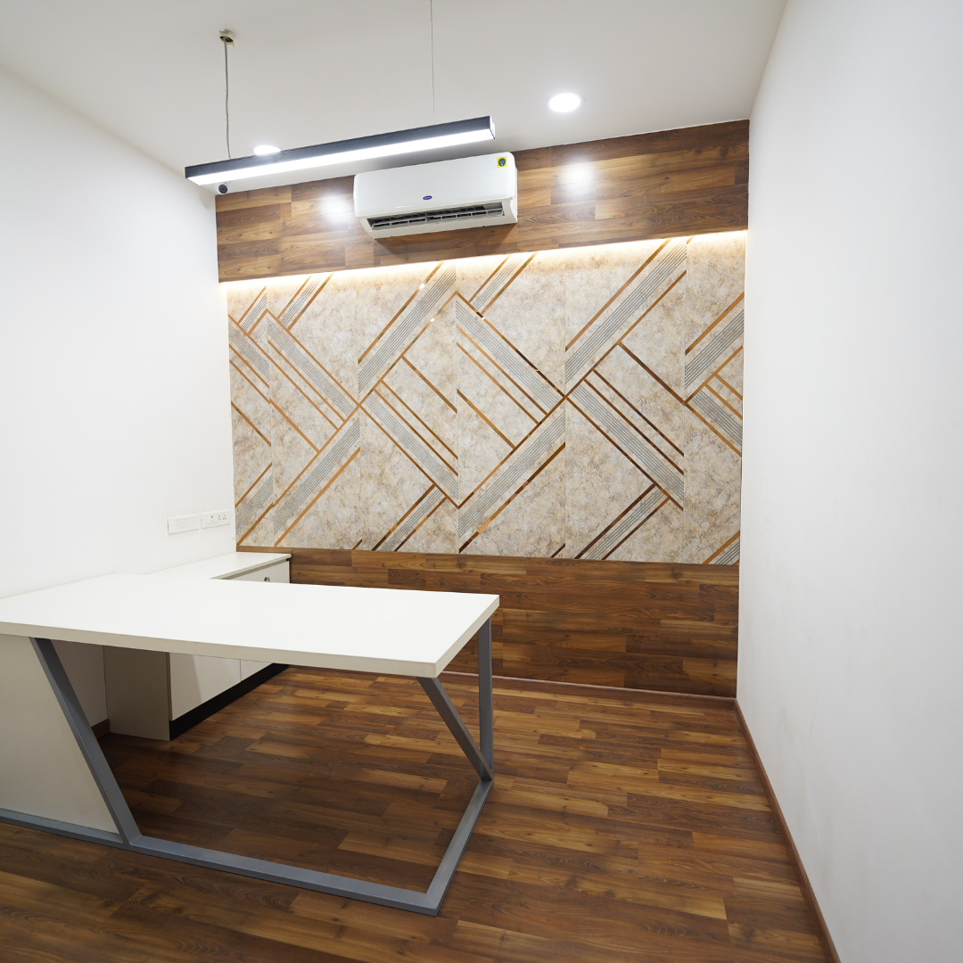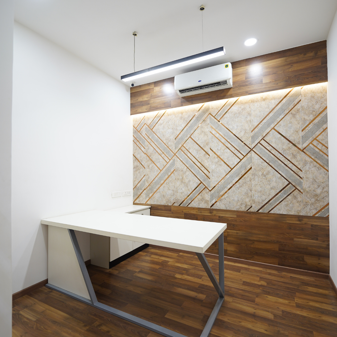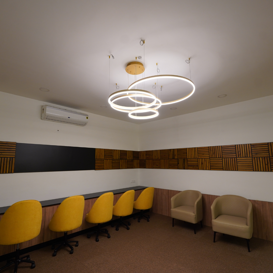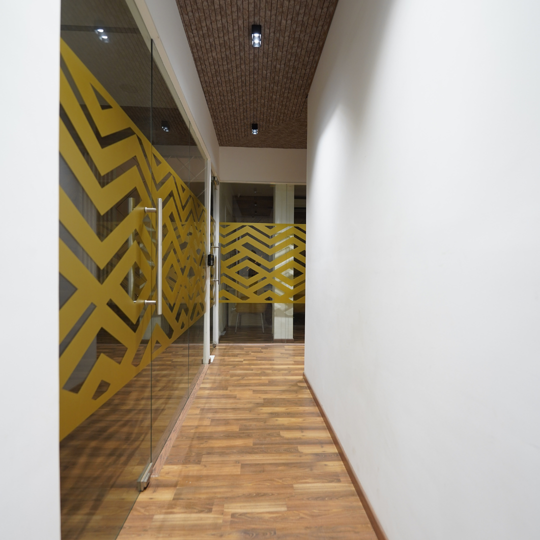 It is a corporate office; theme followed with logo as one could find out with color combination. Requirement was Reception & Waiting Lounge, one to one discussion room, Conference room, 4 MD Cabin, Pantry, store room and outdoor sit out.