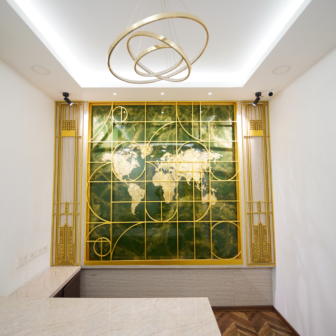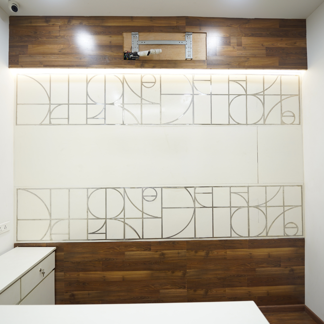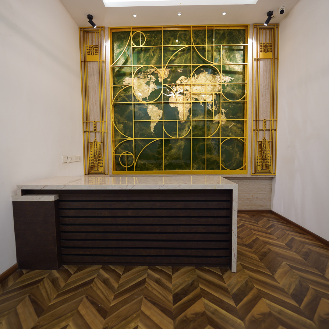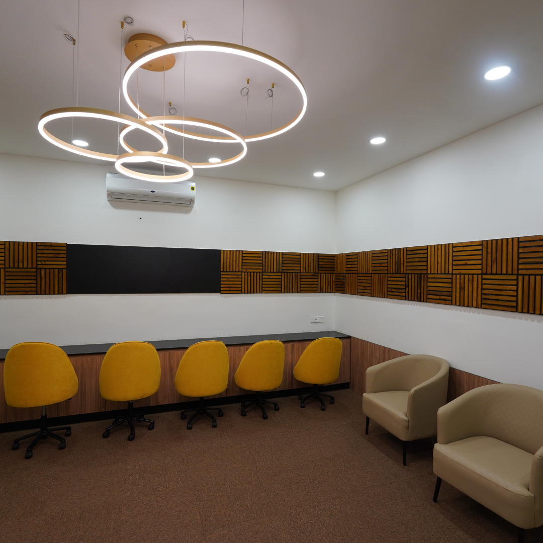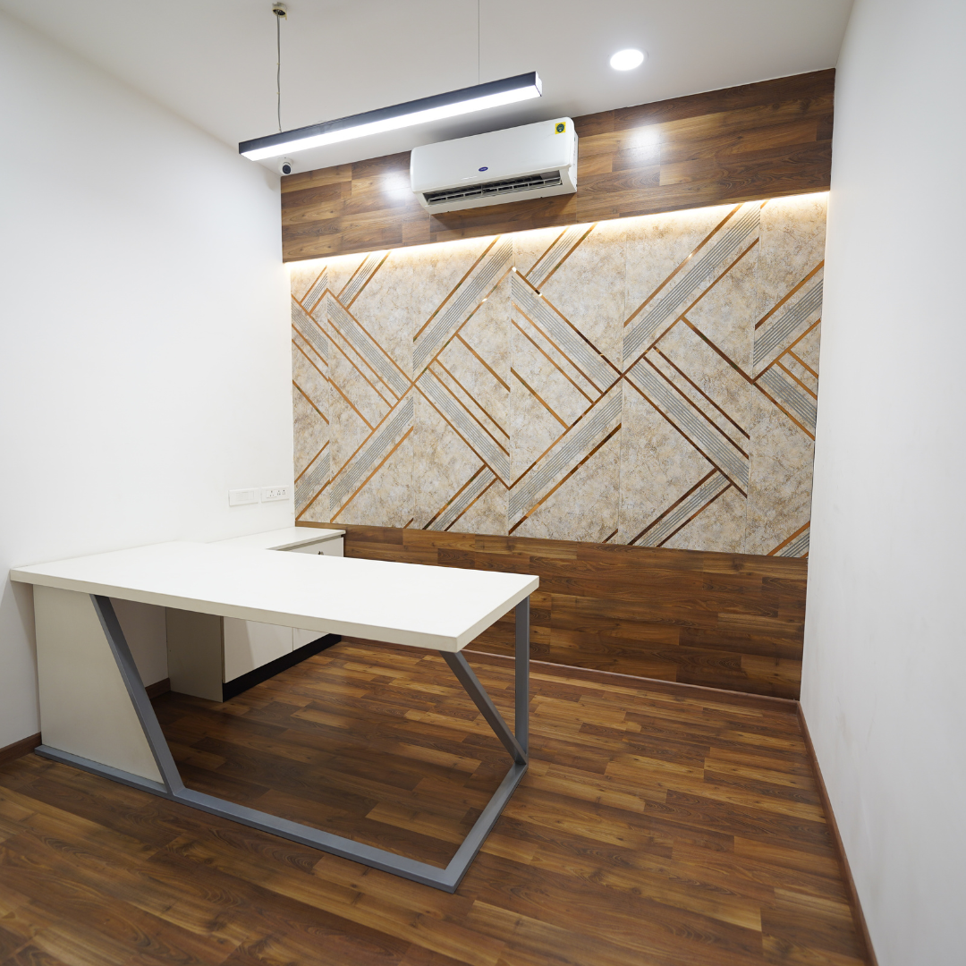 It is a corporate office; theme followed with logo as one could find out with color combination. Requirement was Reception & Waiting Lounge, one to one discussion room, Conference room, 4 MD Cabin, Pantry, store room and outdoor sit out.