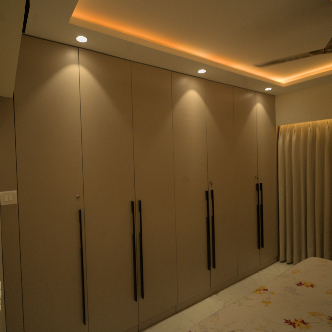It’s a 2BHK Flat at 13th floor, Entire unit with a concept of White & beige combination. False ceiling work carried out combination of Gypsum & wooden finish PVC. Crockery unit of base unit to store & upper cabinet to showcase the display decorative items. Pooja unit is open with shelves as per client requirement.